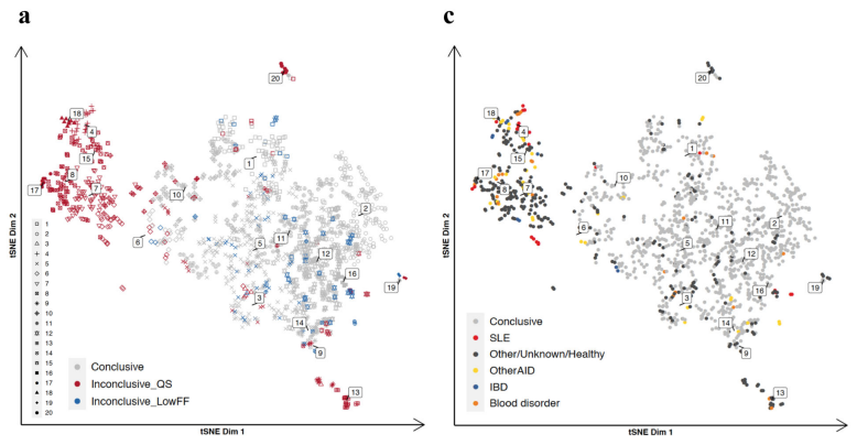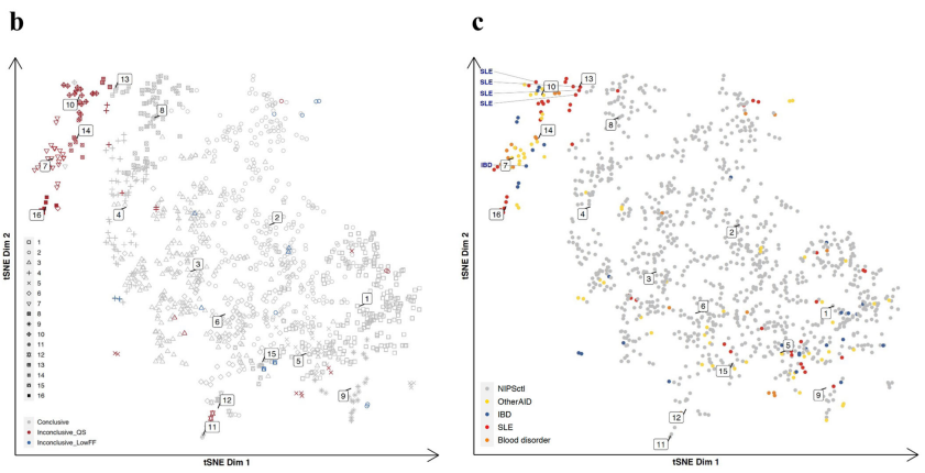 研究团队质疑AID/IBD特异性信号是否也可以在结果明确的NIPS妊娠中观察到。研究团队结合了44例队列I中结果不明NIPS病例(96例样本)的cfDNA图谱,以及队列II-- 69例确诊为AID或IBD的孕妇。这些病例与对照NIPS样本的GIPXplore图谱显示,与疾病相关的NIPS图谱偏离对照组,并如预期的那样形成子簇(图b)。更重要的是,4例SLE和1例IBD患者的NIPS结果与cluster 10、13和7中的结果不明病例共同定位(图c)。