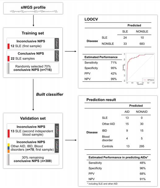 鉴于SLE是一种与妊娠管理高度相关的典型自身免疫性疾病,SLE中观察到的全基因组模式是否可以用于识别SLE患者的妊娠和/或其他AID患者的妊娠?研究团队建立了一个经过SLE病例训练的分类器,并使用产科cfDNA数据对其进行了测试。将NIPS队列分为训练集,其中包括12例结果不明(队列I)和22例结果明确(队列II)SLE病例,以及验证集(n=399)。在训练集中进行了预测分析,以区分SLE和对照NIPS,结果显示敏感性为71%,特异性为95%。ROC分析显示曲线下面积(AUC)值为0.91。将分类器应用于独立验证集,可以正确预测所有重复SLE样本。