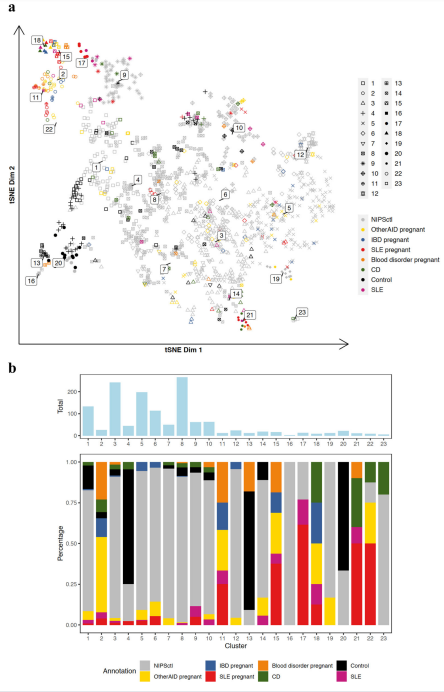 早期检测与自身免疫性疾病(AID)相关的组织和器官损伤已被确定为提高长期生存率的关键,但缺乏非侵入性生物标记物。在AID和炎症性肠病(IBD)中观察到cfDNA水平升高,这促使人们将cfDNA用作潜在的非侵入性诊断和预后生物标记物。研究团队证明,受AID和IBD影响的个体的全基因组cfDNA模式可以与对照组区分开来,并且这种cfDNA模式可用于免疫介导疾病的分类。cfDNA模式作为免疫介导疾病识别的非侵入性生物标记物的潜力为AID和IBD的筛查、诊断和监测铺平了道路。由于妊娠和非妊娠个体的模式相似,并且疾病特异性模式可以在妊娠的前三个月确定,这为预测NIPS后AID和IBD的存在打开了潜力。在临床上不同的AID和IBD中观察到的cfDNA模式的相似性可能反映了这些疾病涉及的炎症过程和/或cfDNA释放和清除机制的相似性。