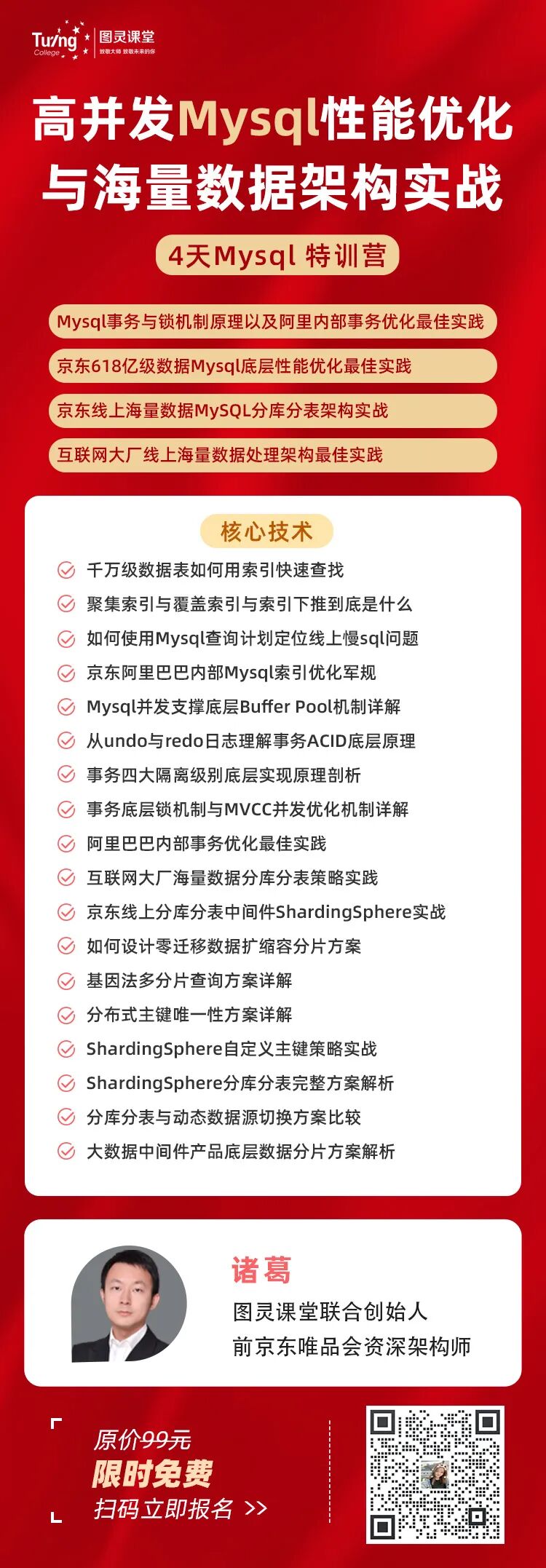 这些情况肯定是过不了面试官那一关的。有人说为了进大厂,特地花了一个月左右时间复习MySQL的相关知识,其实没必要。这里推荐一个免费的Mysql实训营给大家——《高并发Mysql性能优化与海量数据架构实战》,四天专攻MySQL,技术点和面试题一网打尽,助你向大厂精准突围。