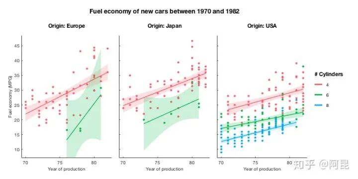 翻遍这个问题下的所有回答,发现凡是提到Matlab的,其评价中常有‘锯齿’,‘菜鸟’,‘难看’,‘不忍直视’等标签。然而,2020年了,技术提升了,观念进步了,当一些基本问题解决后,Matlab还那么‘不堪’吗?观察Mathematica、Origin、Python/matplotlib、R/ggplot2等软件绘制的数据、结果图,其与Matlab图的差异主要体现在点、线、面等对象属性(位置、尺寸、颜色等)的不同上。既然只是属性的不同,那是不是只要修改一下这些信息,就可以实现各种软件绘图风格之间的转换了呢?比如,这是高赞回答 @冯昱尧用Python/matplotlib绘制的一幅图:我们用Matlab默认属性来绘制,效果是这样的(没加误差棒):然后,只需再修改一下位置、尺寸、颜色等信息,就可以得到风格差不多的图(没加误差棒):当我们用这一思想来思考该如何绘制插图时,就很容易实现自己的小想法,仿造甚至创造出理想的插图。比如,某一天,发现傍晚的天空颜色很美,心想:为什么不能把它画到论文插图里呢?(见:Matlab论文插图配色2——自然渐变)再比如,某一天,看到女朋友的照片,觉得很美,心想:为什么不能把她画到论文插图里呢?(见:Matlab论文插图配色1——是女朋友的颜色)这时,有朋友就要说了:“哎呀答主,你整这些个花里花哨的东西,还不是得一行代码一行代码的敲出来啊,太麻烦了吧。”就像R有ggplot2,Python有matplotlib,Matlab其实也有很多现成的绘图工具包,并不需要你自己开发。Pierre Morel [1] 结合ggplot2,开发了gramm工具,用于绘制复杂图形。