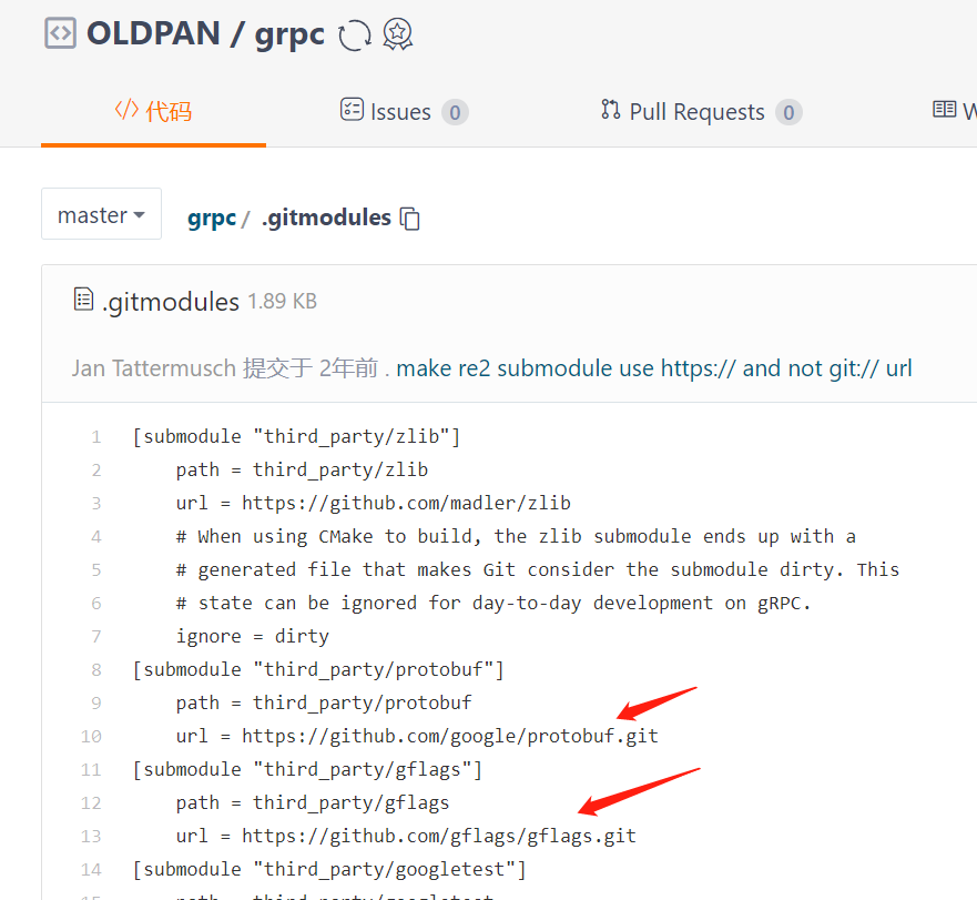 当然也需要将这些库的submodule中的库也修改为国内源,比如grpc这个库依赖很多第三方库,克隆的时候,这是要一个一个下载的: