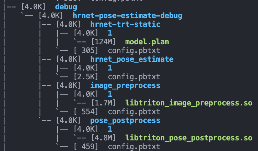 triton模型目录结构 debug目录下有一个模型文件夹叫做hrnet-pose-estimate-debug的模型文件夹,这个文件夹地址(/path/to/hrnet-pose-estimate-debug)需要传给triton启动命令行 ,文件夹内的四个子模型文件夹,会被triton检测到并且一一加载。