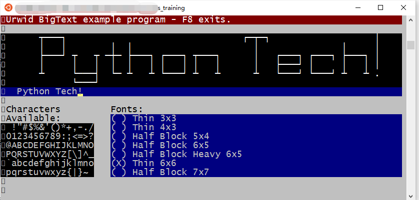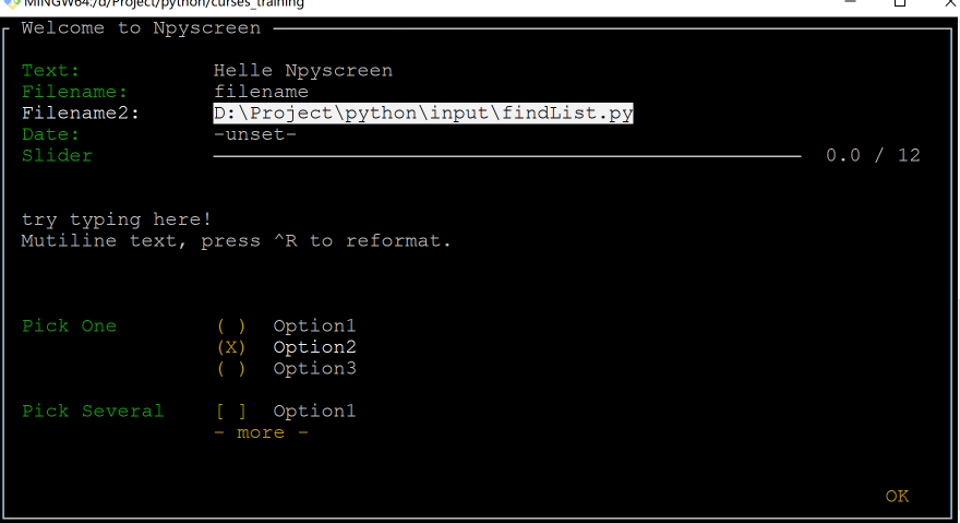 classTestApp(npyscreen.NPSApp): defmain(self): # These lines create the form and populate it with widgets. # A fairly complex screen in only 8 or so lines of code - a line for each control. F = npyscreen.Form(name = "Welcome to Npyscreen",) t = F.add(npyscreen.TitleText, name = "Text:",) fn = F.add(npyscreen.TitleFilename, name = "Filename:") fn2 = F.add(npyscreen.TitleFilenameCombo, name="Filename2:") dt = F.add(npyscreen.TitleDateCombo, name = "Date:") s = F.add(npyscreen.TitleSlider, out_of=12, name = "Slider") ml = F.add(npyscreen.MultiLineEdit, value = """try typing here!\nMutiline text, press ^R to reformat.\n""", max_height=5, rely=9) ms = F.add(npyscreen.TitleSelectOne, max_height=4, value = [1,], name="Pick One", values = ["Option1","Option2","Option3"], scroll_exit=True) ms2= F.add(npyscreen.TitleMultiSelect, max_height =-2, value = [1,], name="Pick Several", values = ["Option1","Option2","Option3"], scroll_exit=True)