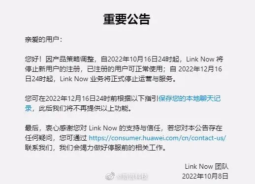 华为 Link Now 官网近日发布公告,自 2022 年 10 月 16 日 24 时起,Link Now 停止新用户注册。自 2022 年 12 月16 日 24 时起,Link Now 业务将正式停止运营和服务。