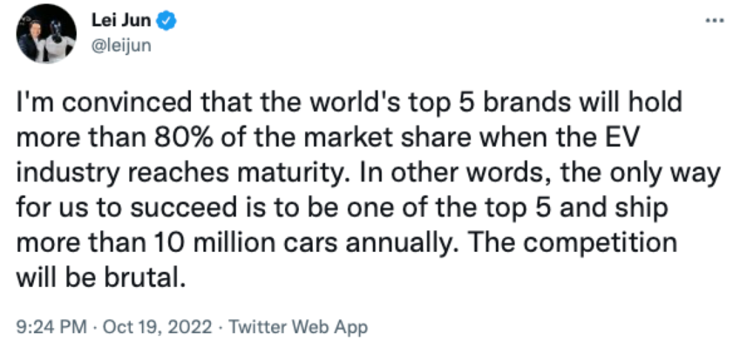 雷军在社交媒体表示:我相信,当电动汽车行业成熟时,世界前五大品牌将占据 80% 以上的市场份额。换言之,我们成功的唯一途径是成为前五名之一,每年出货量超过1000 万辆,竞争将是残酷的。