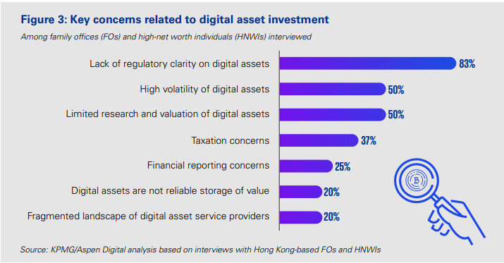 由于虚拟资产相当新颖,家族办公室和高净值人士对投资于该资产类别仍有保留,尤其是在监管和估值方面。半数受访者表示,