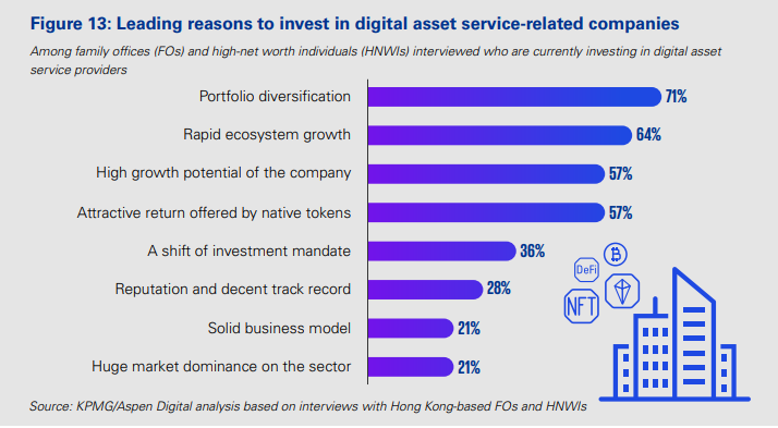根据毕马威中国与Aspen Digital的联合报告《投资虚拟资产──家族办公室及高净值投资者对虚拟资产配置的观点》,家族办公室与高净值人士对虚拟资产的兴趣大幅提升,预期未来虚拟资产于其资产配置的比例将会更高。