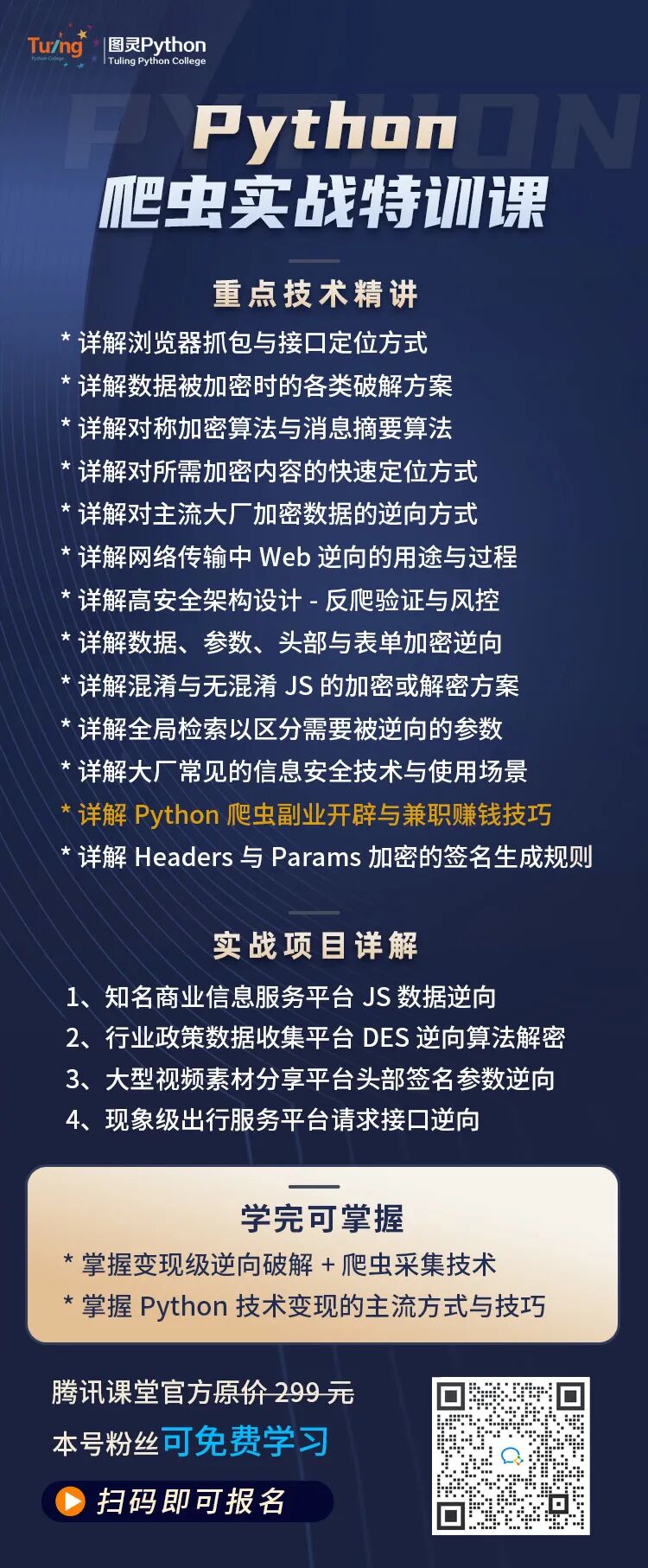 话虽如此,但这单也不是说接就能接到,接爬虫私活需要有足够充沛的技术储备。技术不够,就接不到单。公众号后台最近也收到近千条留言,几乎全是关于爬虫技术的问题咨询。包括Akaimai、5秒盾、WebPack、JS逆向调试、逆向登录、数据逆向、请求参数逆向、多重加密解析、JS二次加密、AES算法、RSA算法、JS混淆、二进制压缩在内的爬虫相关技术,不断地被无数人反复问及。对于想以快速度高效率的方式来搞定技术的朋友来说,我推荐大家直接来腾讯课堂报名学习Python爬虫实战特训课