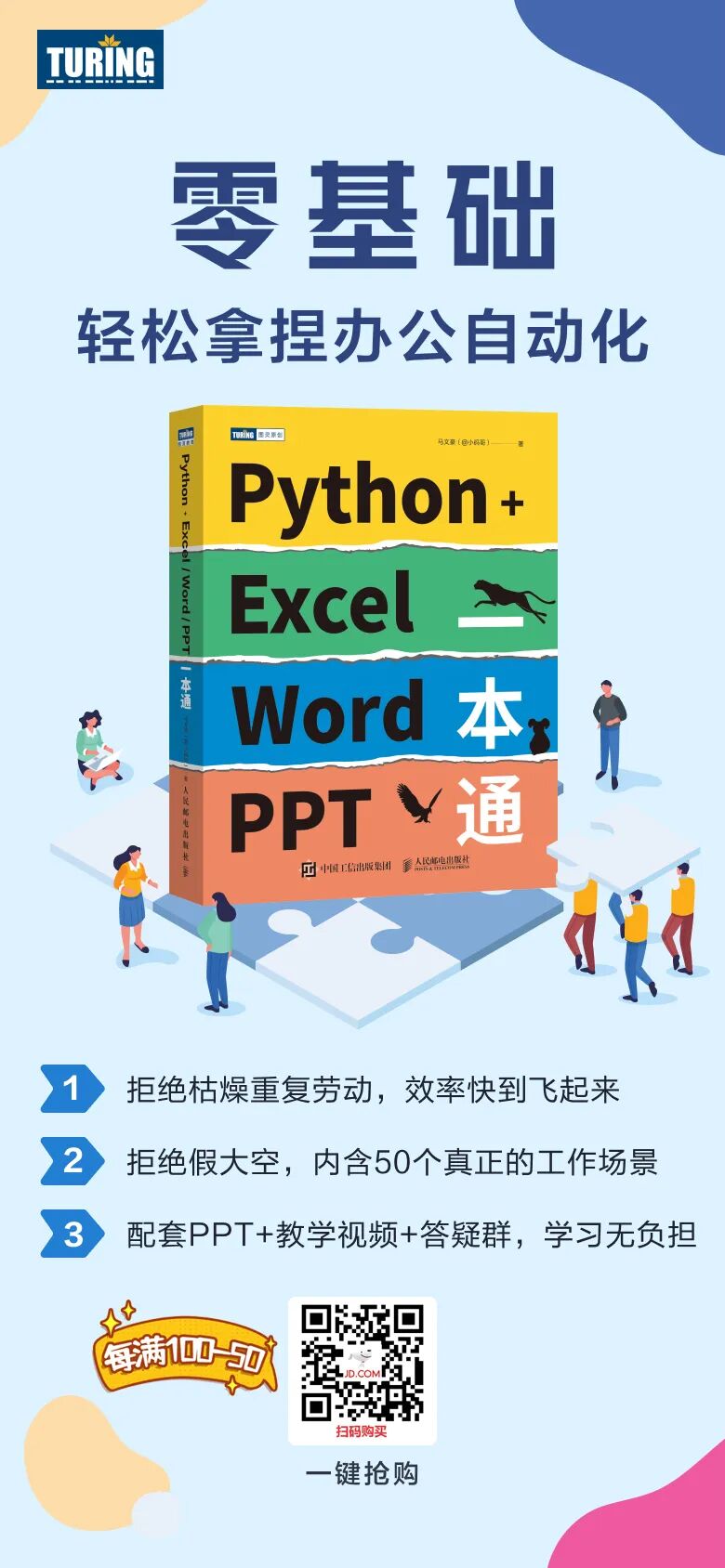 一本适合编程小白学习的Python办公自动化书籍,提高职场办公效率,附赠PPT/源代码/重点教学视频讲解和作者一对一指导。快扫描下方海报上的二维码抢购吧!