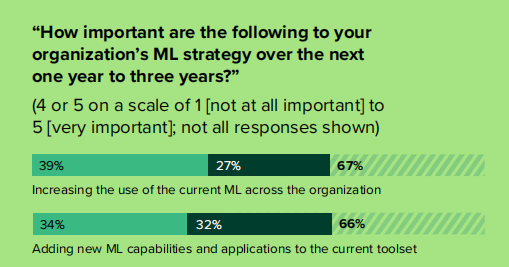在机器学习的开发和发布时长上,大部分受访者选择了1到5年之间,占比总计72%。其中,一半以上的人表示他们的应用发布在1到2年。而实际上,成熟的机器学习战略需要3年及以上的沉淀期,达到这个标准的占比只有四分之一左右,其中只有5%的企业已经应用5年以上。此外,有53%的受访者计划通过利用ML来提高业务效率。在当下的大数据和数据分析战略上,有46%的人选择了使用多云(包括私有云);44%选择研究堆栈性能,从而更好地利用数据进行模型架构;41%选择扩大规模以满足增长的数据量的需求。而在未来的一年到三年中,ML的主要战略应用方向为:自动检测异常数据(40%)、透明应用的自动接收和基础设施的更新(39%),以及让AI应用符合新的监管和伦理要求(39%)等。