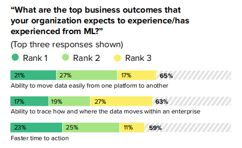 除了技术能力,机器学习在人员和流程管理上也面临不小的挑战。其中,认为打破内部数据孤岛最具挑战性的比例为41%,39%的人选择了将学术模型转化为可以部署的产品。此外,分别有38%的人选择了降低AI风险和打破外部的数据孤岛,还有36%的人认为最大的困难在于处理大规模、多样化和混乱的数据集。无论是数据孤岛、模型转化,还是数据集混乱,都体现出学术与商业化之间的鸿沟,尤其是在模型的转化上,当使用ML并将其进行用例扩展时,很多人发现数据流的透明度、可追溯性以及可解释性都很难得到清晰的呈现。也正因此,在ML落地前景不明确的情况下,管理层会认为基于机器学习的业务实现很难看到商业价值。而如果与投资回报没有明确关系,管理者在这一技术上的投入意向就会明显下降。有73%的受访人认为机器学习在数据透明、可追溯和可解释性上还存在挑战,投入意向的不明朗加剧了技术落地的困难,良性的循环还有待形成。