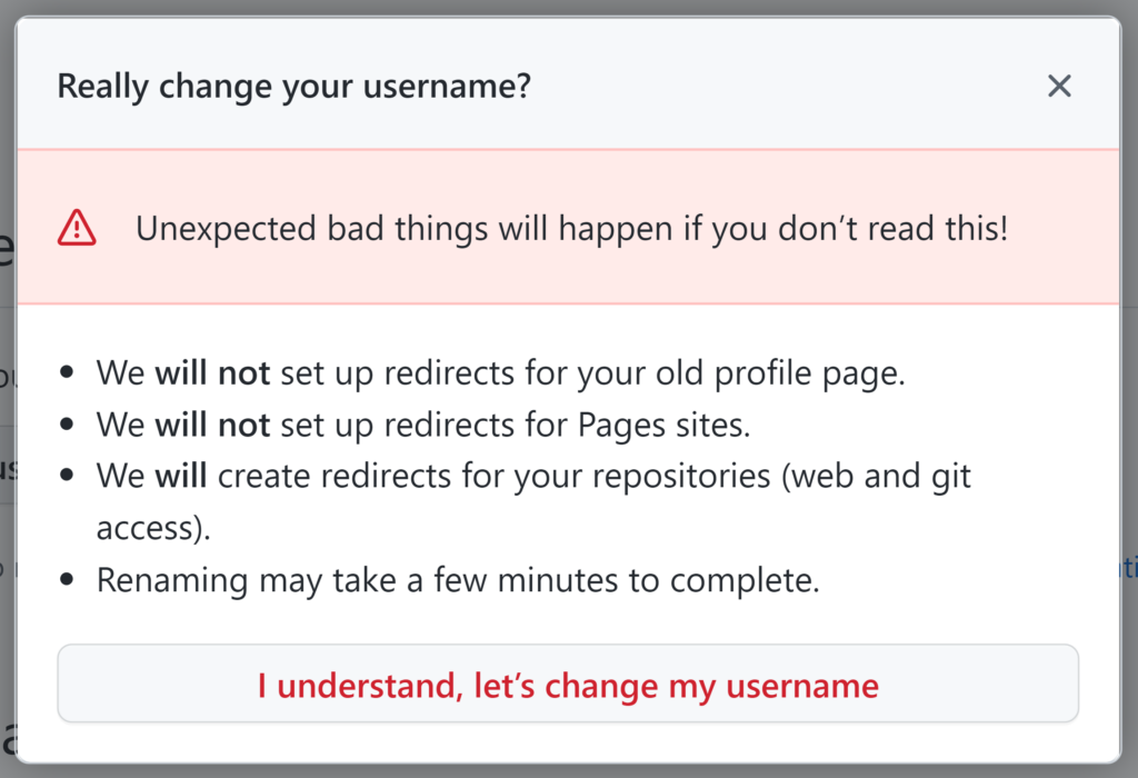 在接受警告信息并修改用户名后,GitHub会自动设置从旧的库URL转到新URL的重定向规则。而用户不会意识到GitHub库所有者用户名的变化。