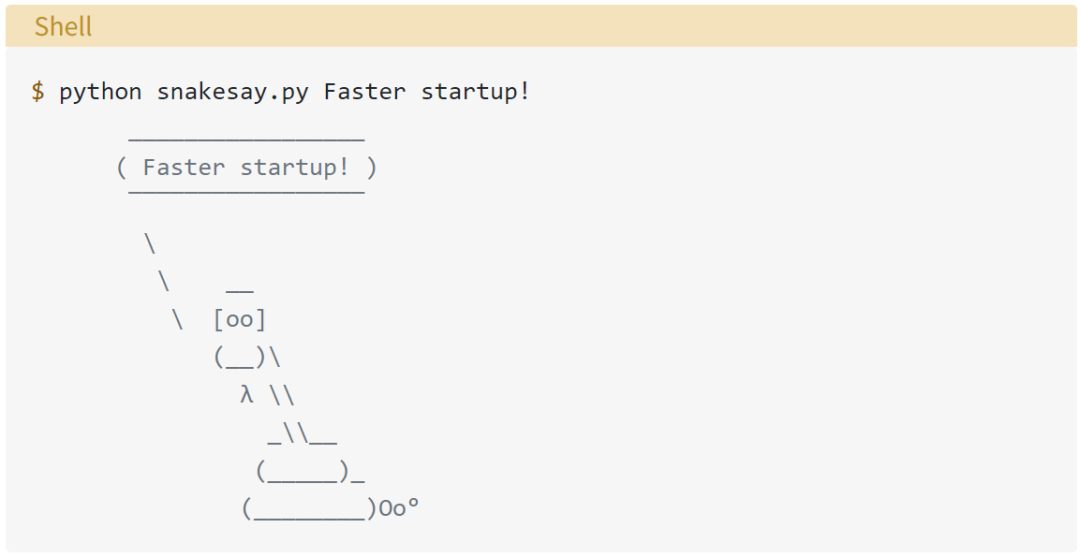 在很多情况下,与运行代码所需时间相比,启动程序需要的时间可以忽略不计。但是在运行时间较短的脚本中,如典型的命令行应用程序,启动时间可能会显著影响程序性能。比如考虑如下脚本,它受到了经典 cowsay 程序的启发。