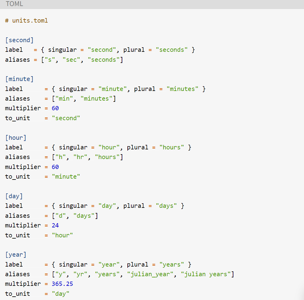 TOML 是 Tom's Obvious Minimal Language 的缩写。这是一种在过去十年中流行起来的配置文件格式。在为包和项目指定元数据时,Python 社区已将 TOML 作为首选格式。虽然 TOML 已被使用多年,但 Python 并没有内置的 TOML 支持。当 tomllib 添加到标准库时,Python 3.11 中的情况发生了变化。这个新模块建立在 toml 第三方库之上,允许解析 TOML 文件。以下是名为 units.toml 的 TOML 文件示例: