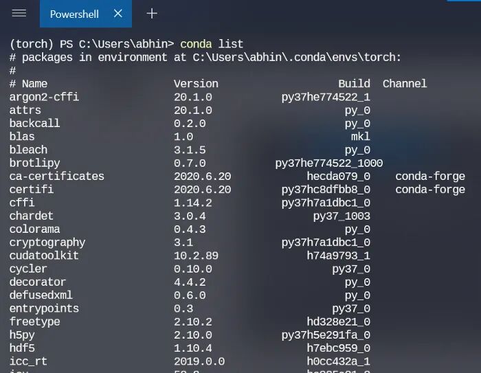 > conda create --name torch python=3.7 > conda activate torch> conda install nb_conda > python -m ipykernel install --user --name torch --display-name “Python 3.7 (torch)” 如果环境设置成功,你可以在环境列表中看到它们。