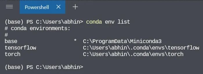 > conda init powershell 然后,你可能会在左边看到 (base),如上图所示,此时你已不在任何环境中。之后,你再进入任何环境,你应该都会看见环境名。