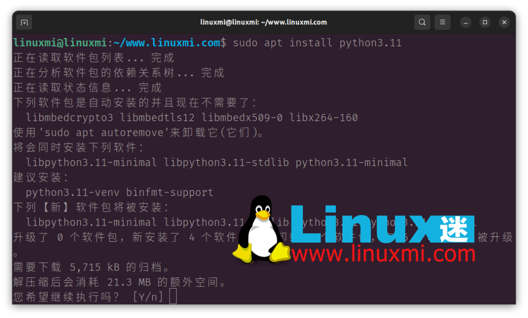 询问时键入用户密码(无星号反馈),然后按 Enter 继续2. 然后通过以下命令刷新包缓存,尽管它在 Ubuntu 20.04+ 中自动完成:3.最后,通过以下命令安装python 3.11:sudo apt install python3.11