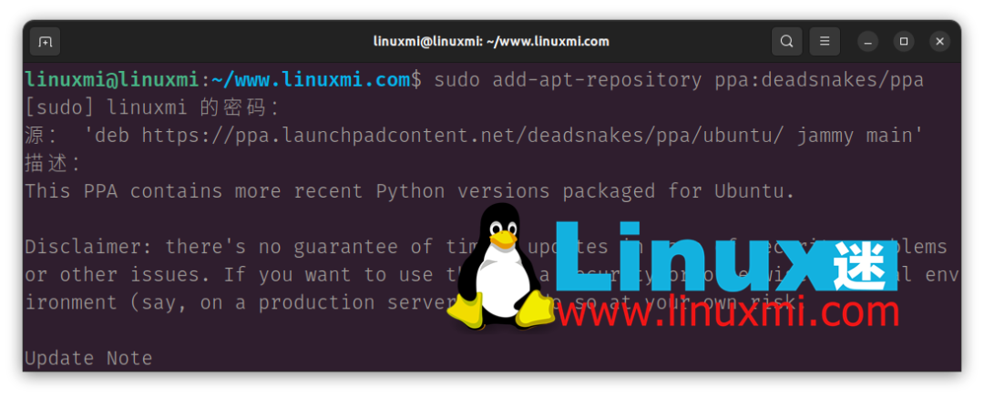 对于Ubuntu 22.04,Ubuntu20.04,Ubuntu 18.04 及其衍生版本,如 Linux Mint,有一个流行的 Deadsnakes PPA 维护Python 3.11以及其他Python版本的软件包。注意:PPA 不支持 Ubuntu 22.10。您可以按照底部链接从源码压缩包构建它。1.首先,按按Ctrl + Alt + T在键盘上打开终端。打开后,运行命令以添加 PPA:sudo add-apt-repository ppa:deadsnakes/ppa