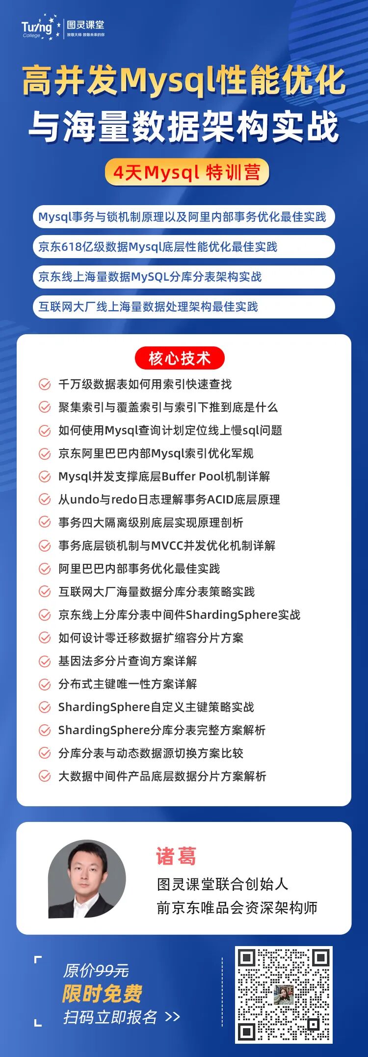这些情况肯定是过不了面试官那一关的。有人说为了进大厂,特地花了一个月左右时间复习MySQL的相关知识,其实没必要。这里推荐一个免费的Mysql实训营给大家——《高并发Mysql性能优化与海量数据架构实战》,四天专攻MySQL,技术点和面试题一网打尽,助你向大厂精准突围。