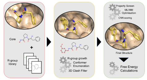 (左)用户指定受体、配体母核核官能团列表,以及它们的结合位点。(中)Rdkit用于连接选定的R group并枚举具有刚性母核的可用构象异构体。(右)可能的生物活性构象异构体使用ML/MM势能函数进行结构优化。使用卷积网络评分函数预测结合亲和力并评估分子特性。输出最终结构用于进一步基于自由能的结合亲和力评估。