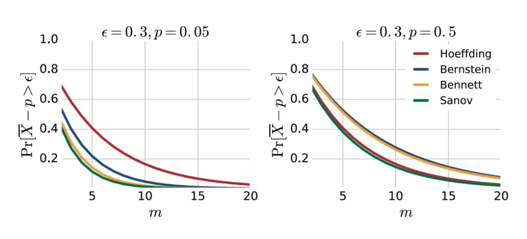 的伯努利试验(Bernoulli trial)的均值,霍夫丁不等式、班纳特不等式、伯恩斯坦不等式和萨诺夫不等式给出的尾部概率上界如下图所示。 ▲ 对于概率为 p 的伯努利试验的均值,霍夫丁不等式、班纳特不等式、伯恩斯坦不等式和萨诺夫不等式给出的尾部概率上界
