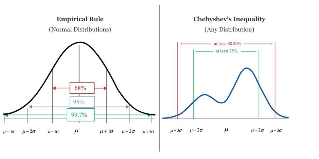 为界。切比雪夫不等式的用途和正态分布的 68−95−99.7 法则类似,但可以应对更一般的概率分布。此不等式保证,对于一系列范围很广的随机变量,有至少 75% 的值分布离期望两个标准差之内的范围当中,有至少 88.9% 的值分布离期望三个标准差之内的范围当中。切比雪夫不等式是马尔可夫不等式的直接推论。