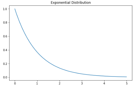 指数分布是泊松点过程中事件之间时间的概率分布。指数分布的概率密度函数如下: X = np.linspace(0 , 5 , 5000 ) exponetial_distribtuion = stats.expon.pdf(X, loc=0 , scale=1 ) plt.subplots(figsize=(8 ,5 )) plt.plot(X, exponetial_distribtuion) plt.title("Exponential Distribution" ) plt.show() 二项分布
