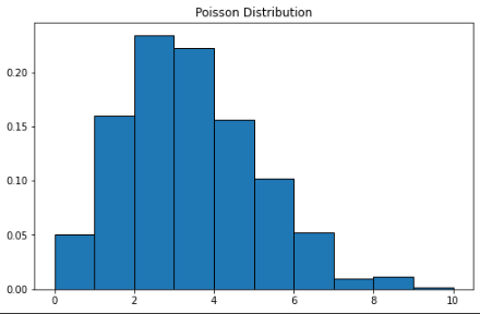 泊松分布以法国数学家西蒙·丹尼斯·泊松的名字命名。这是一个离散的概率分布,这意味着它计算具有有限结果的事件——换句话说,它是一个计数分布。因此,泊松分布用于显示事件在指定时期内可能发生的次数。 如果一个事件在时间上以固定的速率发生,那么及时观察到事件的数量(n)的概率可以用泊松分布来描述。例如,顾客可能以每分钟 3 次的平均速度到达咖啡馆。我们可以使用泊松分布来计算 9 个客户在 2 分钟内到达的概率。 λ 是一个时间单位的事件率——在我们的例子中,它是 3。k 是出现的次数——在我们的例子中,它是 9。这里可以使用 Scipy 来完成概率的计算。 from scipy import stats print(stats.poisson.pmf(k=9 , mu=3 )) X = stats.poisson.rvs(mu=3 , size=500 ) plt.subplots(figsize=(8 , 5 )) plt.hist(X, density=True , edgecolor="black" ) plt.title("Poisson Distribution" ) plt.show()