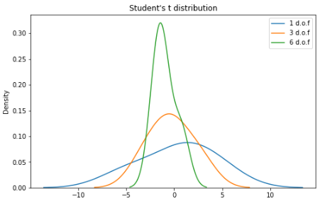 学生 t 分布(或简称 t 分布)是在样本量较小且总体标准差未知的情况下估计正态分布总体的均值时出现的连续概率分布族的任何成员。它是由英国统计学家威廉·西利·戈塞特(William Sealy Gosset)以笔名“student”开发的。 n 是称为“自由度”的参数,有时可以看到它被称为“d.o.f.” 对于较高的 n 值,t 分布更接近正态分布。 import seaborn as sns from scipy import stats X1 = stats.t.rvs(df=1 , size=4 ) X2 = stats.t.rvs(df=3 , size=4 ) X3 = stats.t.rvs(df=9 , size=4 ) plt.subplots(figsize=(8 ,5 )) sns.kdeplot(X1, label = "1 d.o.f" ) sns.kdeplot(X2, label = "3 d.o.f" ) sns.kdeplot(X3, label = "6 d.o.f" ) plt.title("Student's t distribution" ) plt.legend() plt.show()卡方分布