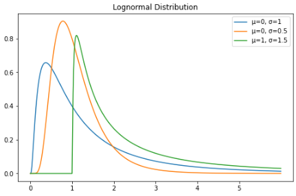 高斯分布可能是最常听到也熟悉的分布。它有几个名字:有人称它为钟形曲线,因为它的概率图看起来像一个钟形,有人称它为高斯分布,因为首先描述它的德国数学家卡尔·高斯命名,还有一些人称它为正态分布,因为早期的统计学家 注意到它一遍又一遍地再次发生。 σ 是标准偏差,μ 是分布的平均值。要注意的是,在正态分布中,均值、众数和中位数都是相等的。 当我们绘制正态分布的随机变量时,曲线围绕均值对称——一半的值在中心的左侧,一半在中心的右侧。并且,曲线下的总面积为 1。 mu = 0 variance = 1 sigma = np.sqrt(variance) x = np.linspace(mu - 3 *sigma, mu + 3 *sigma, 100 ) plt.subplots(figsize=(8 , 5 )) plt.plot(x, stats.norm.pdf(x, mu, sigma)) plt.title("Normal Distribution" ) plt.show() 对于正态分布来说。经验规则告诉我们数据的百分比落在平均值的一定数量的标准偏差内。这些百分比是: 对数正态分布 对数正态分布是对数呈正态分布的随机变量的连续概率分布。因此,如果随机变量 X 是对数正态分布的,则 Y = ln(X) 具有正态分布。 对数正态分布的随机变量只取正实数值。因此,对数正态分布会创建右偏曲线。 X = np.linspace(0 , 6 , 500 ) std = 1 mean = 0 lognorm_distribution = stats.lognorm([std], loc=mean) lognorm_distribution_pdf = lognorm_distribution.pdf(X) fig, ax = plt.subplots(figsize=(8 , 5 )) plt.plot(X, lognorm_distribution_pdf, label="μ=0, σ=1" ) ax.set_xticks(np.arange(min(X), max(X))) std = 0.5 mean = 0 lognorm_distribution = stats.lognorm([std], loc=mean) lognorm_distribution_pdf = lognorm_distribution.pdf(X) plt.plot(X, lognorm_distribution_pdf, label="μ=0, σ=0.5" ) std = 1.5 mean = 1 lognorm_distribution = stats.lognorm([std], loc=mean) lognorm_distribution_pdf = lognorm_distribution.pdf(X) plt.plot(X, lognorm_distribution_pdf, label="μ=1, σ=1.5" ) plt.title("Lognormal Distribution" ) plt.legend() plt.show() 泊松分布