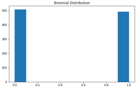 可以将二项分布视为实验中成功或失败的概率。有些人也可能将其描述为抛硬币概率。 参数为 n 和 p 的二项式分布是在 n 个独立实验序列中成功次数的离散概率分布,每个实验都问一个是 - 否问题,每个实验都有自己的布尔值结果:成功或失败。 本质上,二项分布测量两个事件的概率。一个事件发生的概率为 p,另一事件发生的概率为 1-p。 X = np.random.binomial(n=1 , p=0.5 , size=1000 ) plt.subplots(figsize=(8 , 5 )) plt.hist(X) plt.title("Binomial Distribution" ) plt.show() 学生 t 分布