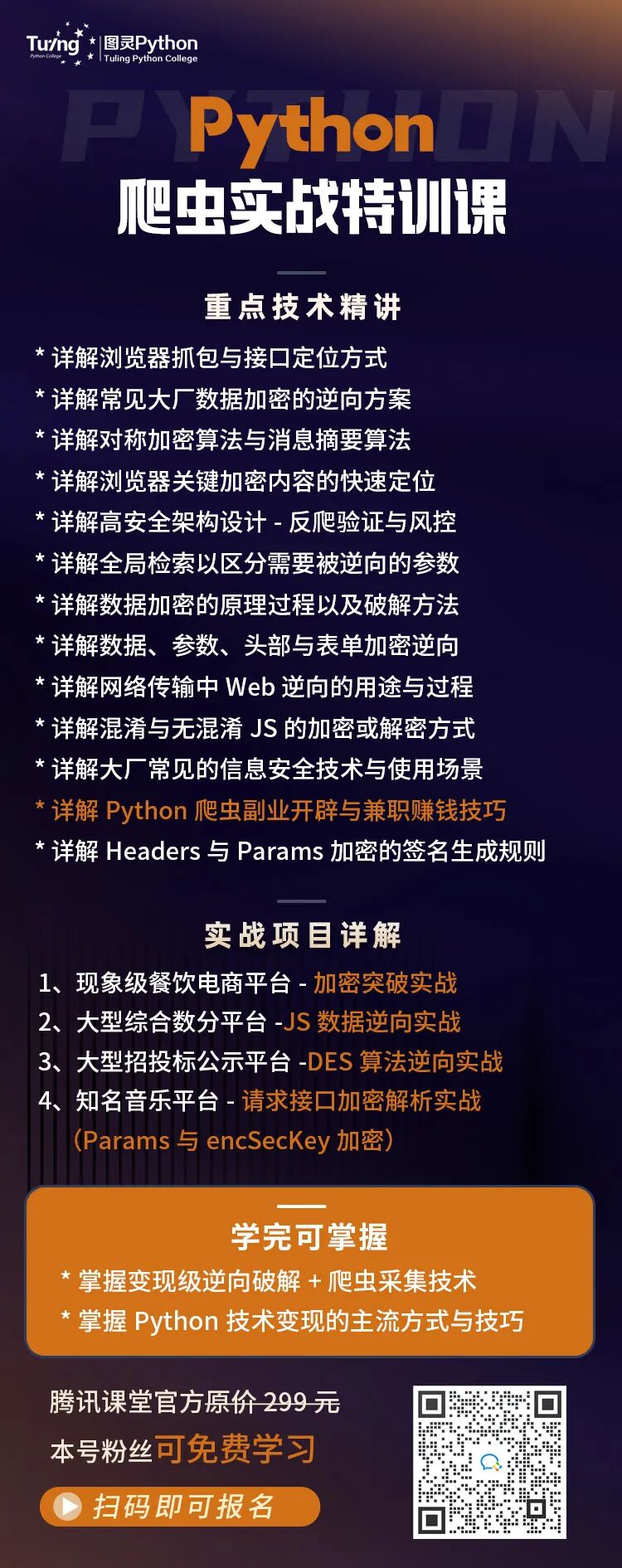 腾讯课堂官方特训费299元,本号粉丝有福利,立即报名可免费学习!这是一套专讲爬虫与反爬虫攻防的实战特训课程,迄今为止已经帮助了超3W学员快速进阶!本次课程将由国际大数据竞赛获奖大佬亲身指导,带领大家进行一线前沿技术体系+多重逆向解析项目实战的综合技术速成训练!