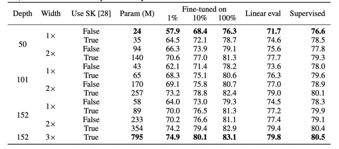 SimCLR v2 论文的表格。请注意监督学习、微调(100%)自监督和自监督 + 线性探测之间在性能上的一般相似性(图源:https://arxiv.org/abs/2006.10029)