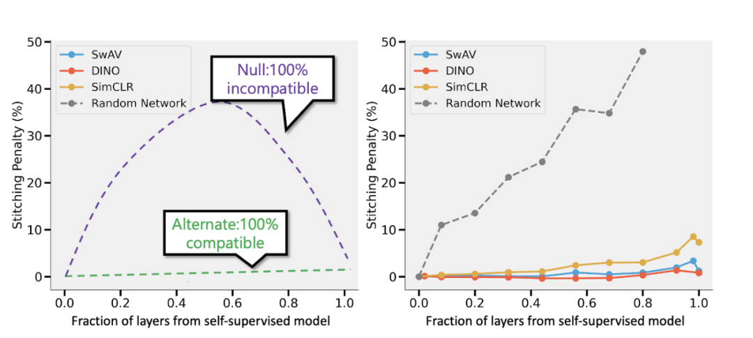 拼接自监督模型和 Bansal 等人的监督模型(https://arxiv.org/abs/2106.07682)。左:如果自监督模型的准确率(比如)比监督模型低 3%,则当层的 p 部分来自自监督模型时,完全兼容的表示将导致拼接惩罚为 p 3%。如果模型完全不兼容,那么我们预计随着合并更多模型,准确率会急剧下降。右:合并不同自监督模型的实际结果。