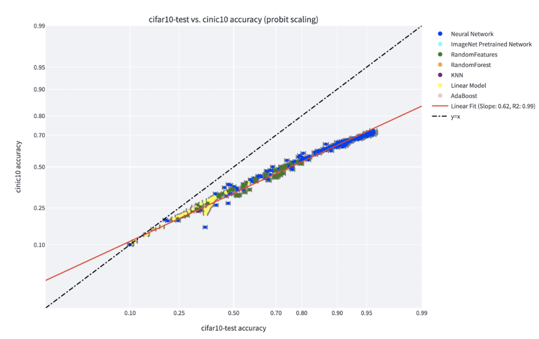 CIFAR-10 上训练并在 CINIC-10 上测试的分类器的 accuracy on the line 现象。图源:https://millerjohnp-linearfits-app-app-ryiwcq.streamlitapp.com/