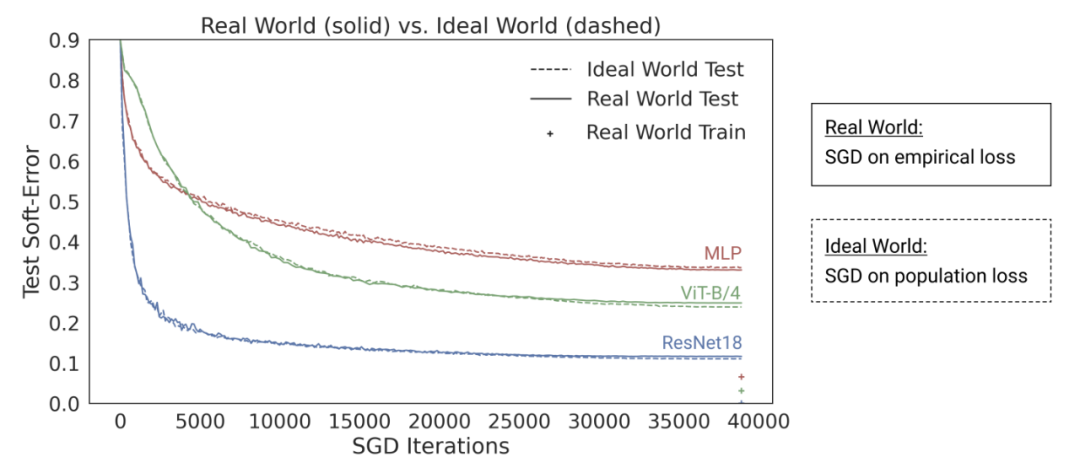 Nakkiran-Neyshabur-Sadghi“deep bootstrap”论文表明,现代架构在 “过度参数化” 或“欠采样”状态下表现类似(模型在有限数据上训练多个 epoch,直到过度拟合:上图中的 “Real World”),在“欠参数化” 或者 “在线” 状态下也是如此(模型训练单个 epoch,每个样本只看一次:上图中的 “Ideal World”)。图源:https://arxiv.org/abs/2010.08127