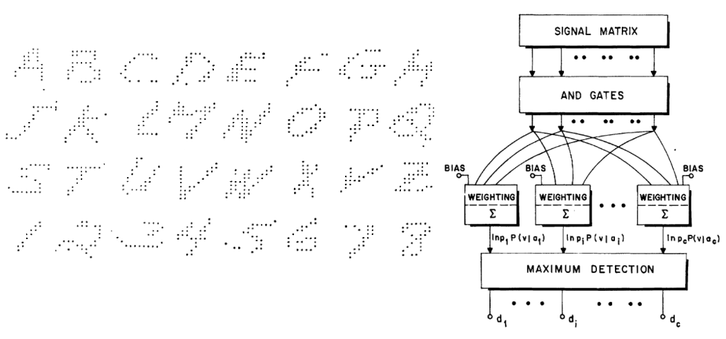 类似地,下图中的 Highleyman 的手写字符数据集和用于拟合它的架构 Chow(1962)(准确率约为 58%)也会引起很多人的共鸣。