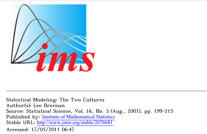 文章链接:https://projecteuclid.org/journals/statistical-science/volume-16/issue-3/Statistical-Modeling--The-Two-Cultures-with-comments-and-a/10.1214/ss/1009213726.full