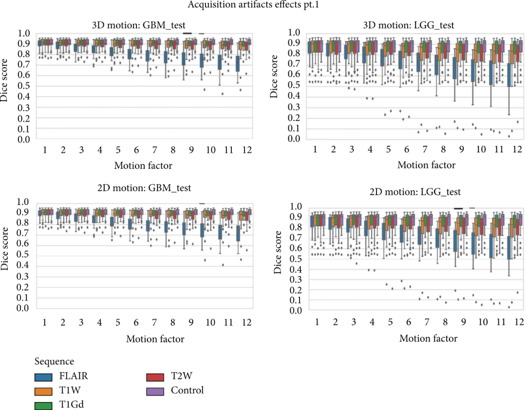 图2. 运动伪影(3D和2D)。图中显示了TCGA-14-3477的脑部MRI的冠状面、矢状面和轴向切面,肿瘤以紫色区域显示。图3:采集伪影:混叠、信号损失和场不均匀性伪影。左栏显示原始图像改变,右栏显示体积改变。图4:预处理伪影:混叠、信号损失和场不均匀性伪影。左栏显示原始图像改变,右栏显示体积改变。下一步对这些伪影进行评估,以查看每个伪影对模型预测能力的影响大小,主要指标是Dice分数,这是评估分割模型的最常见指标之一。使用statsmodels包执行了单向重复测量ANOVA测试,阈值设定为p<0.01。将每个患者的Dice分数与不同的伪影强度水平进行比较,消除随机误差(图5,图6)。