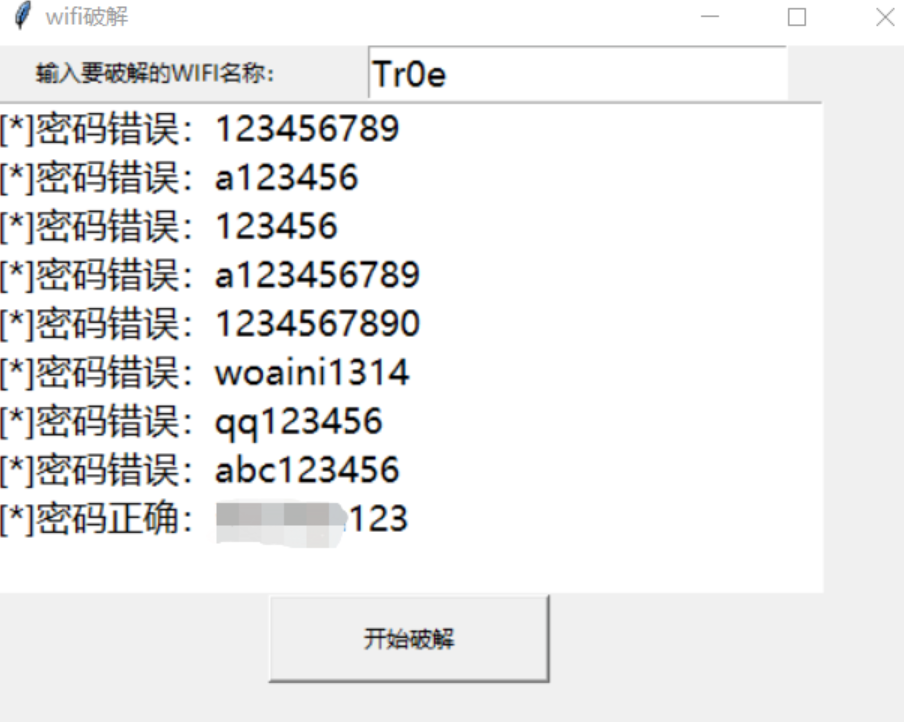 print("正在破解 SSID 为 %s 的 WIFI密码,当前校验的密码为:%s"%("Tr0e",pwd))