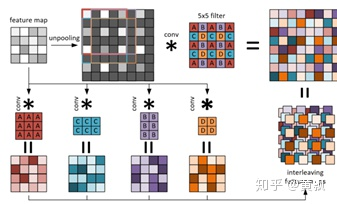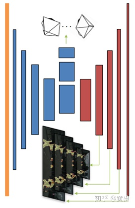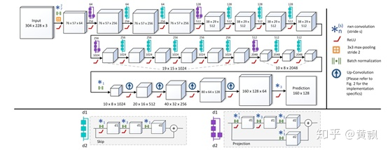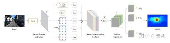 其网络框架主体是基于Resnet-50,在上采样过程中采用了独特的方式,将逆卷积用up-pooing+conv的方式替代了,将Resnet中的project模块进行了一定的改进。其中上采样过程中将特征图利用0元素进行填充,然后利用一类特殊的卷积核进行特征提取,这一过程可以先卷积,然后错位相连得到,原理如下:其中可以发现卷积核并非是正方形,而是矩形,不过过程其实是一样的。而projection部分,即resnet中原图先经过1×1卷积再与特征图相连的部分,变为:其代码链接为:https://github.com/iro-cp/FCRN-DepthPrediction,基于Tensorflow和matconvnet。- 将深度估计问题变为回归问题的缺点在于,太依赖于数据集的场景,并且由于图像中深度往往是分层的,类似于等高线之类的,所以也有学者将深度估计变为一个分类问题,而类别数就是将最远实际距离划分为多份而制作的。以此为代表的是CVPR2018中《Deep Ordinal Regression Network for Monocular Depth Estimation》所提出的DORN框架: