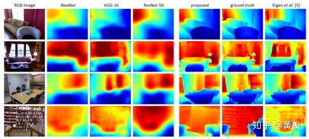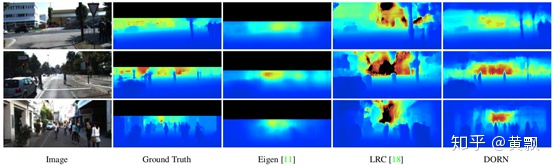 该框架2018年在多个数据集上取得了第一的名次,不过现在有个别算法超越了。可以看到,原图在经过密集特征提取之后,增加了一个场景理解模块,这一模块包含5个部分。其中full-image encoder部分与传统的自编码器不同:可以看到其先是利用池化进行下采样,将其拉伸为向量之后,利用全连接层进行编解码,然后还原为原图大小。而ASPP模块是利用了膨胀卷积(dilated convolution)进行特征提取,膨胀倍数分别为6,12,18。五个部分concat得到最终的特征图。再进入有序回归模块,实质上是多分类器。其将深度范围划分为多个区间:最后输出W×H×2K的结果,K代表深度区间,2K是因为每两个相邻的通道值2n表示深度小于n的概率,2n+1表示深度大于n的概率,二者利用softmax归一化。其效果如下:可以看到,DORN对于深度的细节把握得非常好,其速度约为2fps,代码基于caffe平台,链接为:https://github.com/hufu6371/DORN无论是回归还是分类,都是以深度信息作为标签的监督算法,因此其受限于训练集场景,仅限于刷榜。4.2 结合双目视觉的单目深度估计