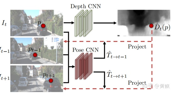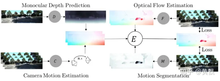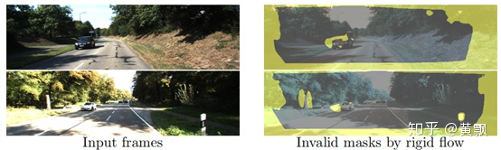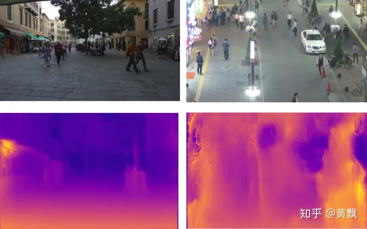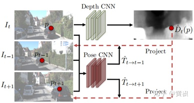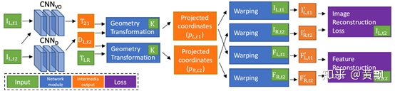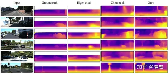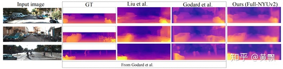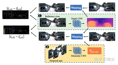 代码是基于tensorflow的:https://github.com/tinghuiz/SfMLearner,不过有pytorch的复现版本:https://github.com/ClementPinard/SfmLearner-Pytorch果不其然,在CVPR2018中商汤又提出了GeoNet,该网络在SFM的基础上增加了光流监督信息:可以看到,前半部分的深度估计和相机位姿估计都跟SFM一样,只是在后面增加了光流的输出,先利用前半部分得到刚性结构的光流,后半部分增加一个非刚性光流预测环节,二者之和就是最终的光流。效果:可以看到,GeoNet的深度估计效果并没有特别突出,代码是基于Tensorflow的:https://github.com/yzcjtr/GeoNet同样的还有CVPR2018的《Unsupervised Learning of Monocular Depth Estimation and Visual Odometry with Deep Feature Reconstruction》一文中提到的Depth-VO-Feat:直接从这个网络架构可以看到包含了两个部分的图像重构,一个是左视图和右视图的重构,一个是前后两帧间的重构,重构的意义在于找到对应像素点的联系,并非直接利用左右视图进行误差计算,可以看到图中对于右视图的边缘填充。由于该框架假设场景是Lambertian的,即无论从哪个角度观察,其光照强度是一致的,那么这对于图像的重构就很敏感,因此,作者又添加了特征的重构,框架一致。对于训练细节,除了图像和特征的L1重构误差之外,也加入了边缘平滑性约束,骨干网络是Resnet50的变种。对于深度估计,其预测的是深度信息的倒数。效果如下:可以看到,深度估计的效果还是中规中矩,不过其可以用来做视频中相机的移动轨迹预测,这一点在多目标跟踪(MOT)中对于手持相机的场景有所帮助。代码是基于caffe的:https://github.com/Huangying-Zhan/Depth-VO-Feat