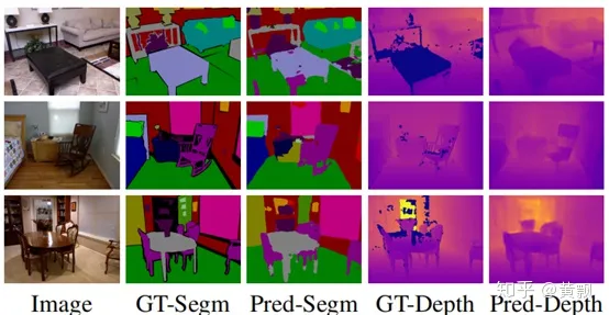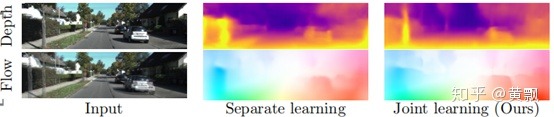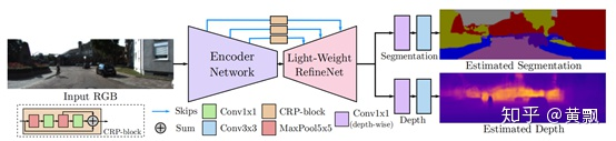可以看到的是,RefineNet在每一个尺度的上采样部分都增加了一个局部提升的网络,用于多尺度输出的融合:所以其主要创新在于采用skip-connection和 Resnet Block的方式不断融合各种分辨率的特征,用于增加更多的细粒度特征,从而方便生成更高分辨率的预测:那么在BMVC2018中则是提出了一种Light-weighted RefineNet算法,顾名思义,就是RefineNet的轻量级网络,其对于512×512大小的图像,速度从RefineNet的20FPS提升到了55FPS(1080Ti),效果略微下降。代码基于Pytorch: https://github.com/DrSleep/light-weight-refinenet那么回到正题,我们提到的这个同时进行深度估计和目标分割的网络框架,对于1200×350大小的输入,其速度为60FPS。网络框架如下:以上的结构通过之前我介绍的深度估计框架以及Light-Weighted RefineNet框架很容易能看懂,之所以比原本的Light-Weighted RefineNet还要快,是因为将其中的部分1×1卷积替换成了MobileNetV2中采用的depthwise卷积方式。对于分割和深度估计任务的结合,从网络框架和损失函数的设计来看可以发现,其除了特征是共享的之外,预测任务是独立的。效果如下:代码仅提供了测试用例:https://github.com/drsleep/multi-task-refinenetECCV2018中《DF-Net: Unsupervised Joint Learning of Depth and Flow using Cross-Task Consistency》一文提出了单目深度估计和光流预测的联合任务框架。不同于单独训练两个任务的方式,作者将二者的一致性进行了考虑,从而做到二者的相互促进,可以看到对比效果:
