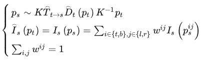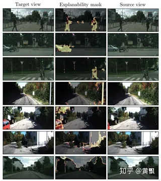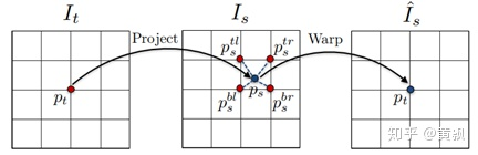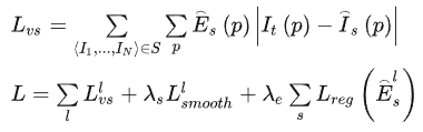 基于视频的单目深度估计大多都是面向相机位姿估计和视觉测距的,其核心就是利用相邻视频帧所产生的运动,近似多视角图像,并对相机位姿进行估计,从而可以估计出相机的移动路线,进一步完成SLAM工作。那么在CVPR2017的一篇《Unsupervised Learning of Depth and Ego-Motion from Video》中则是提出了SFM算法,这篇文章中对于深度估计的求解较为简单,所以效果不是很好,但是提出了基于视频帧序列的相机位姿估计算法。其论文中使用了相邻3帧的信息,不过代码却是用的相邻5帧的信息,整体框架比较简单:可以看到,单目深度估计部分仅仅是针对一帧的,直接采用了Dispnet的网络框架,不过我发现实际上是U-net,而相机位姿估计则是将相邻帧的相对相机位姿变化看作一个含有6个元素的向量(可以理解为x,y,z方向的平移量和旋转量)进行预测。有意思的是,SFM并没有使用深度信息作为标签,而是将深度信息作为一个过程变量,将前后帧图像联系起来,从而做到无监督学习,不过相机位姿的训练还是有监督的:利用预测的相机位姿和深度信息,可估计出目标视图相对原视图的像素点位置,由于预测的像素点位置可能不是整数,为了保证其为整数,将采用双线性插值,其中K是相机参数矩阵:可以看到这里的插值方式是对估计像素点位置处的相邻4个位置的像素进行加权平均,然后作为目标像素点位置处的像素值,新合成的视图和目标视图进行一致性约束。不过上述这种做法受限于静态场景,且无遮挡情况,为了缓解这种问题,作者又加入了一个可解释性网络:该网络的编码部分输出的是相机位姿,解码部分输出的是多个尺度的解释性眼膜,其意义是合成视图中的每个像素点能够被成功建模的概率。而这一部分是没有标签的,所以作者通过设计损失函数将其进行了约束:l指的是尺度,s指的是图片,其中的平滑性约束跟上一节所讲的Monodepth一样,由于解释性掩膜无标签,如果不加约束的话会自动为0,所以利用交叉熵损失函数对其进行了约束,默认为全1矩阵。其效果如下:可以看到,深度估计的效果并不是很好,不过整体的设计思路很新颖,也可以看看其对于解释性掩膜的预测效果:可以发现,对于发生变化的部分,即前景部分,其不可解释性很高,其实这个也能用来估计光流。