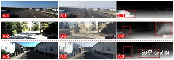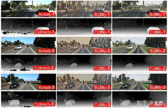 对于单目深度估计模型,目前主要分为基于回归/分类的监督模型,基于双目训练/视频序列的无监督模型,以及基于生成学习的图像风格迁移模型。大概从2017年起,即CVPR2018开始,单目深度估计的效果就已经达到了双目深度估计的效果,主要是监督模型。但是由于现有的数据集主要为KITTI、Cityscapes、NYU DepthV2等,其场景和相机都是固定的,从而导致监督学习下的模型无法适用于其他场景,尤其是多目标跟踪这类细节丰富的场景,可以从论文中看到,基本上每个数据集都会有一个单独的预训练模型。对于GAN,其对于图像风格的迁移本身是一个很好的泛化点,既可以用于将场景变为晴天、雾天等情况,也可以用于图像分割场景。但是深度估计问题中,像素点存在相对大小,因此必定涉及到回归,因此其必定是监督学习模型,所以泛化性能也不好,以CVPR2018的那篇GAN模型为例可以对比:
