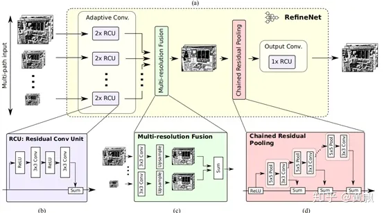 在ICRA2019中《Real-Time Joint Semantic Segmentation and Depth Estimation Using Asymmetric Annotations》中基于图像分割算法RefineNet设计了一个多任务框架。其中RefineNets是CVPR2017中提出的算法,其全局框架是基于Resnet的U-net网络框架,可以输出多尺度的分割图: