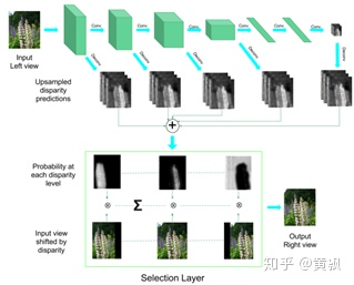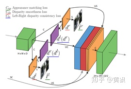 既然监督算法受限于场景,那么近两年则出现了很多无监督算法,其中就包含有利用双目数据进行训练的算法,下面我用几个例子进行说明。首先以CVPR2017中《Unsupervised Monocular Depth Estimation with Left-Right Consistency》一文所提出的Monodepth算法为例。这篇论文算是这类算法的一个开端吧,效果并没有非常优异,但是引出这样一条思路。其网络框架如下:该算法将深度估计问题变成了左右视图立体匹配问题,都是先从原始图预测另外一个视图的视差,然后结合输出另外一个视图。整体框架依赖DispNet,而DispNet又是在FlowNet基础上进行的改变,主要改变是在多尺度衔接出增加卷积层,以保证图像尽可能平滑。经过自编码器之后,分别利用逆卷积、预测的右视图相对左视图的视差+upsample/双线性插值、预测的左视图相对右视图的视差+upsample/双线性插值、原图。有了这些之后,损失函数部分则同时包含有:由于其主要在KITTI_outdoor和Cityscapes上训练的,所以对于室外场景效果会略好,又因为其算法框架比较简单,所以深度信息中的细节比较模糊,尤其是存在遮挡或者物体相连的情况时。测试效果如下:通过其原理和论文中的测试效果来看,其对于室外场景下的深度估计效果还行,不过对于边缘部分的把握不是很好。再加上大多是街景数据,所以对于室内场景的视角具有很大的不适应性。另外,由于立体匹配对于大面积的纯色或者颜色相近的图像块效果很差,所以Monodepth不适用于纹理不清晰的场景,容易将大片颜色类似的图像块视为一个整体。代码是基于tensorflow进行开发的:https://github.com/mrharicot/monodepth,也有pytorch0.4.1的复现版本:https://github.com/ClubAI/MonoDepth-PyTorch。与此同时,在CVPR2018中,由商汤团队在《Single View Stereo Matching》一文中提出了类似的SVS算法,其相对于Monodepth,在细节和场景适应性方面有了很大的提升。从图中不难看出,得到预测的右视图之后,两个视角的图像进行类似于DispNet的立体匹配,从而获得左视图的视差。而关键在于怎么从左视图预测右视图。可以发现,SVS在利用卷积层对左视图进行特征提取之后,分别将每一通道的特征图和原图进行元素乘法,然后再相加。这一部分实际上是借鉴了Deep3D的框架。Deep3D模型是用来将2D图像转化为3D图像对的,其框架为:假设每个通道分别代表着在左视图中每个像素点相对右视图中的视差偏移量的概率分布。综上,SVS实质上就是Deep3D+Dispnet的合体版,其效果图如下:同时可以看看基于KITTI数据集训练的SVS模型在其他数据集上的测试效果:代码是基于caffe开发的:https://github.com/lawy623/SVS4.3 基于视频的相机位姿估计和视觉测距