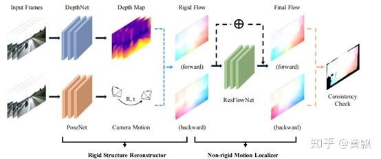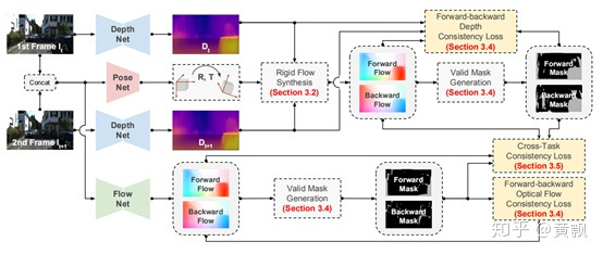 其主要思路是利用无监督的方式从视频中预测深度信息和相机位姿变化,这一部分对于刚性流场景比较适用,即静态背景。通过几何一致性的约束监督,可以将3D的场景流映射到2D光流上,由此与光流预测模型的结果进行一致性约束。具体框架如下:乍一看可以发现网络框架的前半部分很眼熟,图中展示的是分别对前后帧做单目深度估计,然后利用前后帧做相机位姿变化预测和光流预测,结合SFM网络中像素点转移的计算公式,可以利用深度信息和相机位姿变化关系求得在t+1时刻对应像素点位置,由此可以计算刚性流场景下的光流。对于刚性流场景下的合成光流信息和直接预测到的光流信息,二者都反映了相邻两帧的像素点的对应关系,因此作者对此引入了光照约束(利用对比映射和插值,计算每个像素点的像素值差异)和深度的平滑性约束。再来看Forward-Backward模块,由于我们在上面提到了光照一致性约束,但实际上对于重叠区域并不适用,因此加入了前后向一致性的约束。即图中的Valid Mask部分,利用刚性流信息可以检测出一些无效的像素区域,如运动物体、画面边缘等,因为这些都不符合刚性这一条件,那么再在有效区域使用光照一致性假设:感觉这个跟SFM中的Explain Mask一样,然后前后的一致性约束,则是分光流和深度估计两部分,其中深度的一致性跟光照一致性的计算方式一样,而光流的一致性则是真的计算了前向和反向的光流一致性。最后对于深度和光流的共同有效区域,保证二者预测的光流尽可能一致。为了保证更好的训练效果,作者先在SYNTHIA数据集上预训练光流预测,采用的是UnFlownet-C网络,在KITTI和Cityscapes上预训练深度估计和相机位姿预测,采用的是SFM框架,然后进行联合训练。代码基于Tensorflow: https://github.com/vt-vl-lab/DF-Net我前段时间还发现一个多任务的集成框架CVPR2019的CCN算法《Joint Unsupervised Learning of Depth, Camera Motion, Optical Flow and Motion Segmentation》,效果目前好像还是SOTA,其融合了单目深度估计、相机位姿估计、光流估计和运动分割多个任务,代码:https://github.com/anuragranj/cc5 总结